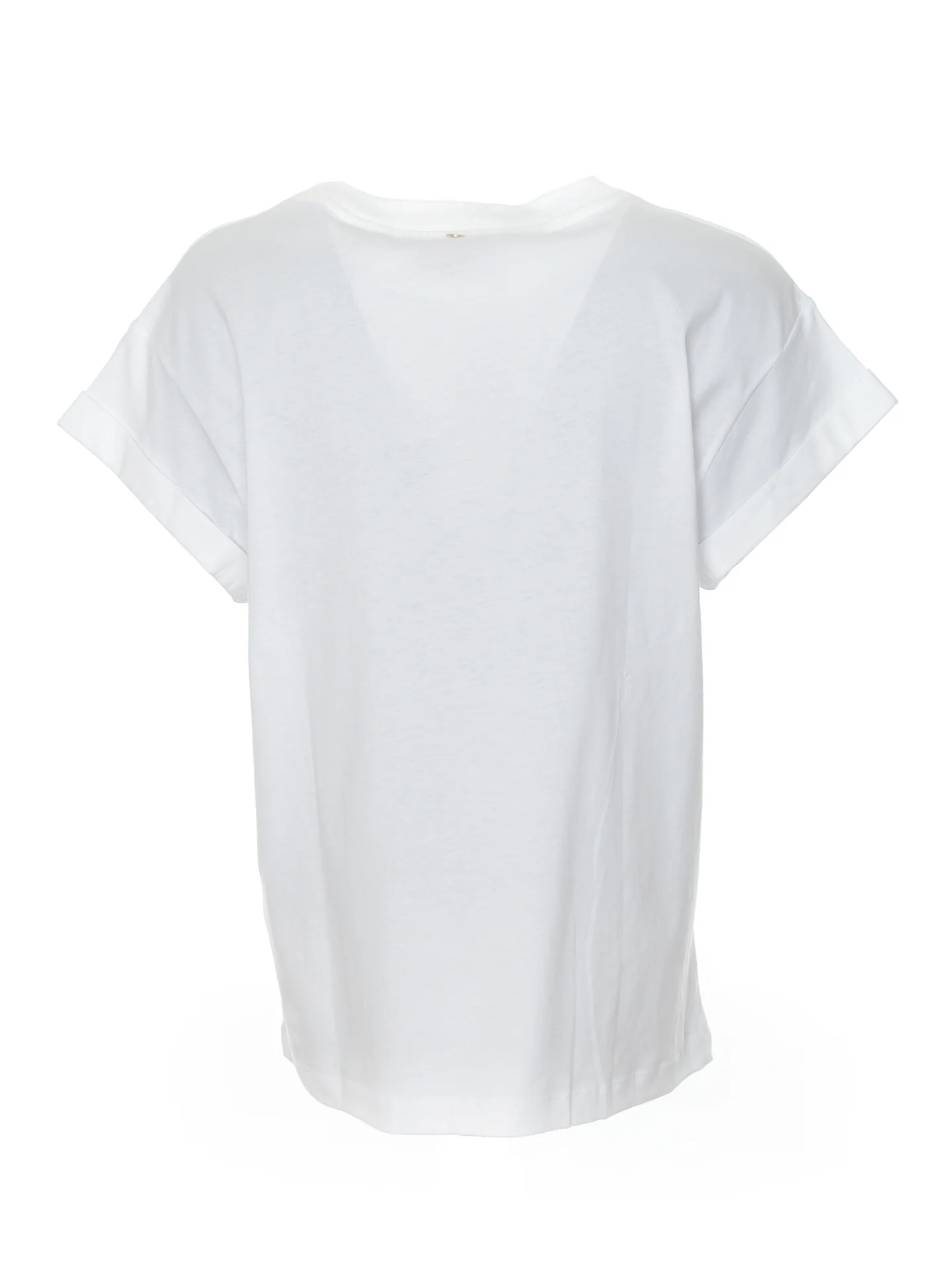 T-Shirt mit geripptem Rundhalsausschnitt*Überschnittene Schulterpartie*Fixierter Umschlag an den Ärmelenden*Leicht semitransparente Optik*Schriftzug-Stitching auf der linken Brust*Gerader Schnitt sowie lässige Passform*Länge: hüftlang