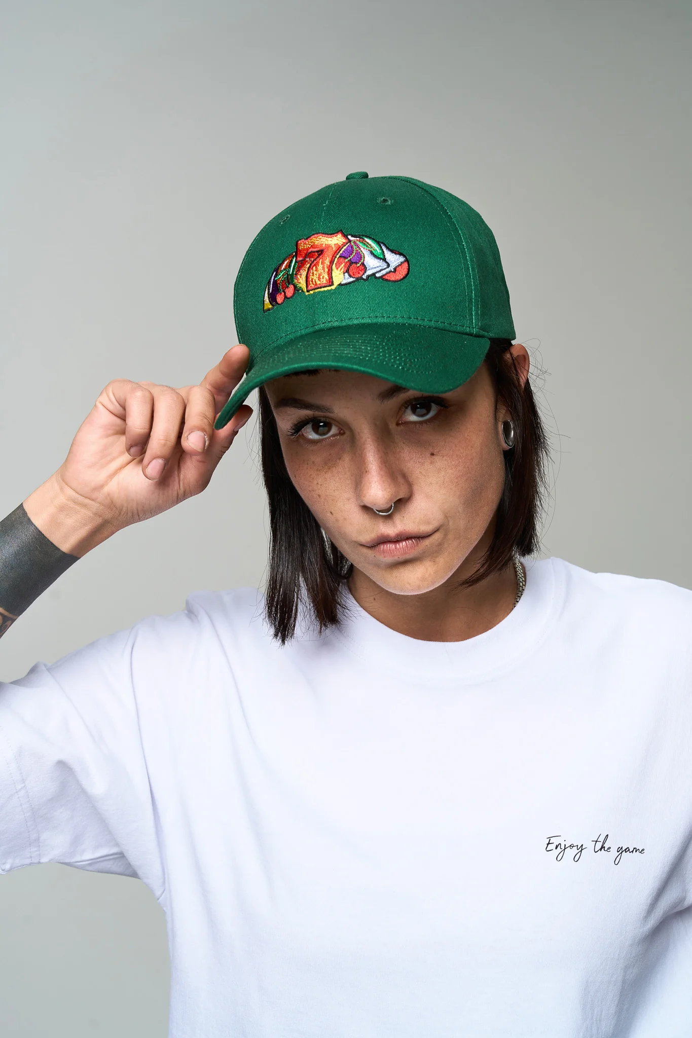 Die bunten Früchte, kultigen Glocken und feurigen Siebenen aus dem Games-Klassiker Fruitinator zieren die Front des dunkelgrünen Basecaps.